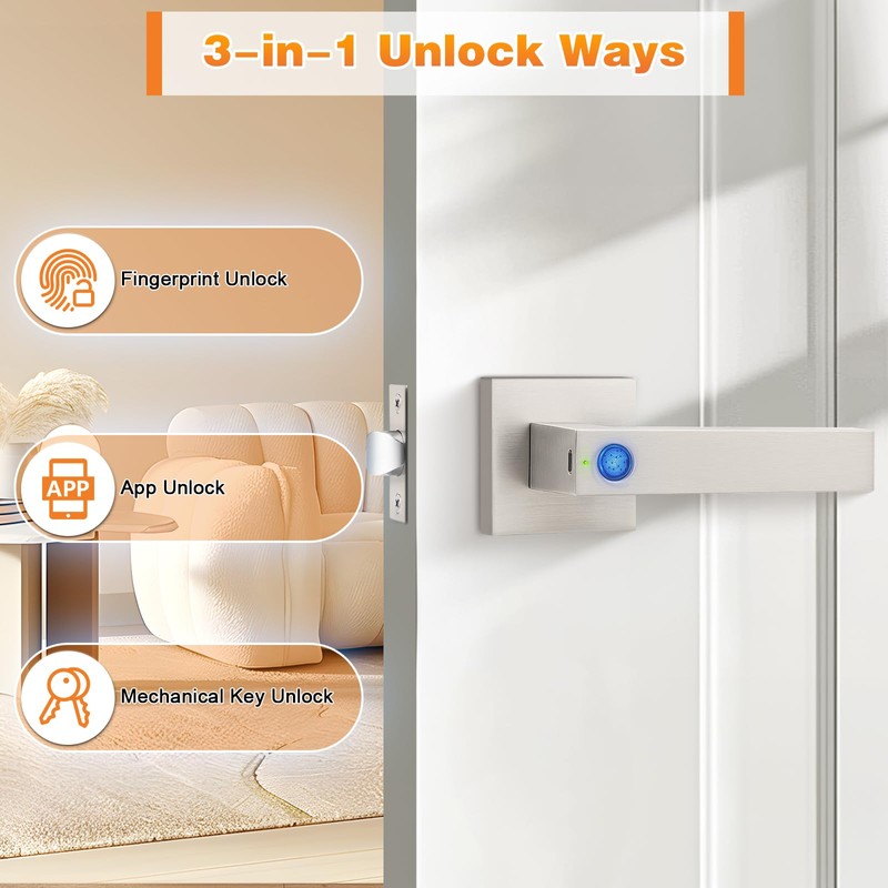 - 【Fingerprint Unlock】 This electronic door lock with handle uses biometric technology, with a recognition rate of up to 99.8%, it can accurately identify your fingerprint and unlock the door in just 0.3s, Securely accommodates up to 50 fingerprints, ensuring seamless access for multiple authorized individuals.