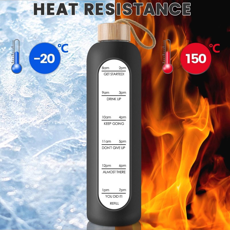 - Durable and Leak Proof :Our unbreakable leak proof and reusable cute small water bottle glass with hourly markings is made of borosilicate glass which is BPA, BPS, PVC, Lead, and Cadmium free; This durable glass waterbottle will not crack under extreme temperature and pressure
