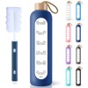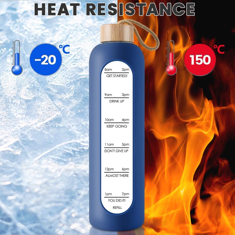 - DURABLE AND LEAK PROOF - Our leak proof, eco-friendly, and reusable cute water bottles with hourly markings is made of borosilicate glass which is BPA, BPS, PVC, Lead, and Cadmium free; This durable and reusable glass bottle will not crack under extreme temperature and pressure