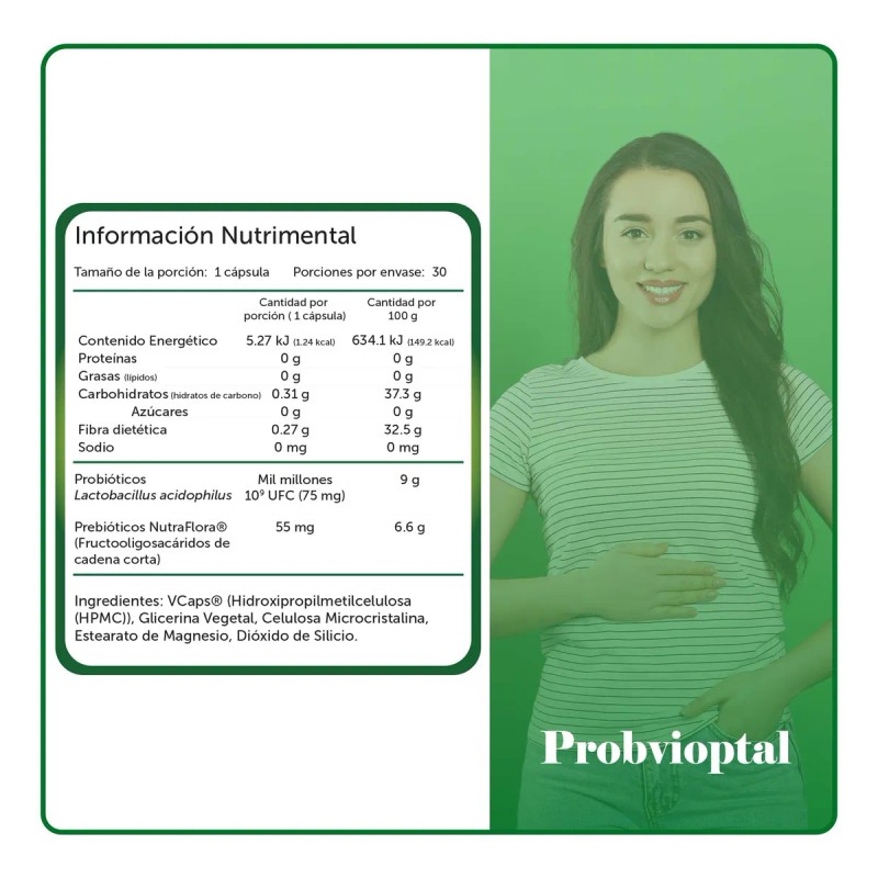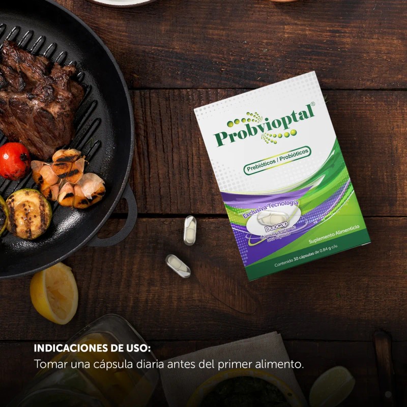 Probvioptal es un suplemento alimenticio que con su fórmula de prebióticos + probióticos el cual se le llama simbiótico, que ayudan a restablecer el equilibrio en el microbiota intestinal. Los prebióticos son ingredientes que suministran energía y nutrientes para la proliferación de los probióticos en el intestino y ayuda a mejorar la salud digestiva y estimular la función inmutaría.