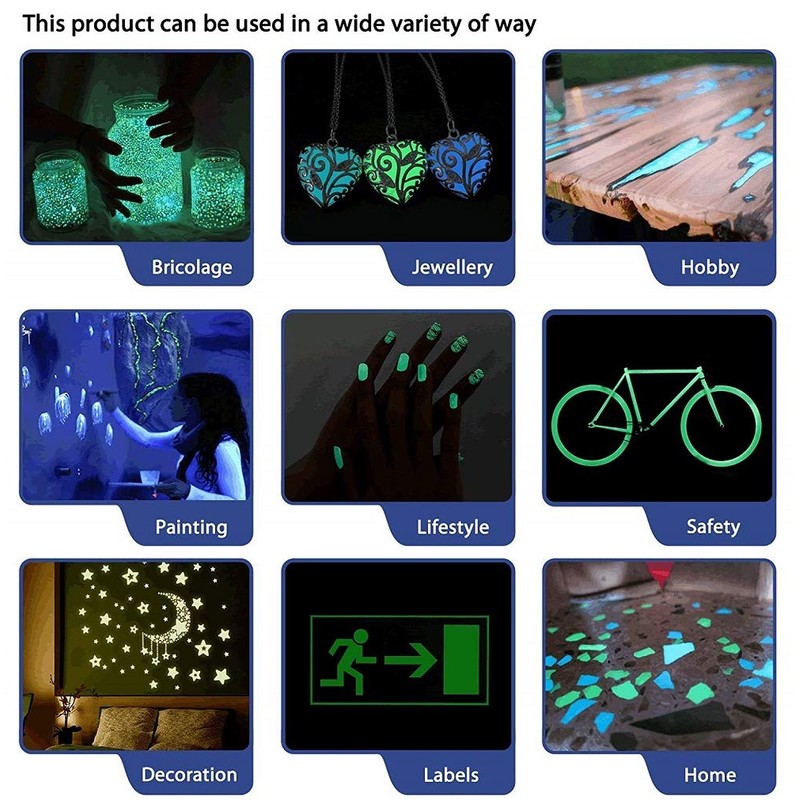 - <p><strong>? HOW TO US</strong><strong>E- </strong>The vibrant pigment powder glows in the dark after being exposed to direct sunlight, indoor lighting, or for a more intense charge, use a bright direct light source: black light UV-tubes or black light bulbs</p>