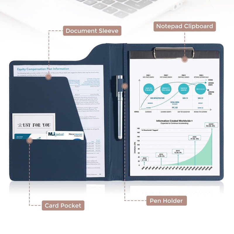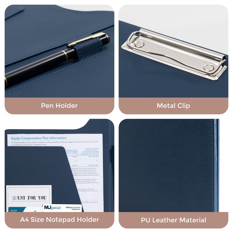 • Designed with 1 notepad clipboard, 1 pen holder, 1 A4 document sleeve, and 1 card pocket