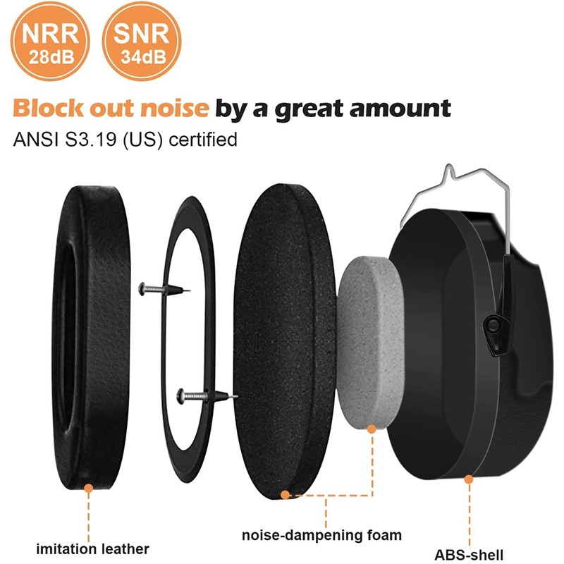- 【CERTIFIED CERTIFIED】Earmuffs made of solid DBS shell and acoustic foam are certified as NRR 28dB noise reduction on ANSI S3.19 (US) test stand, which greatly blocks noise