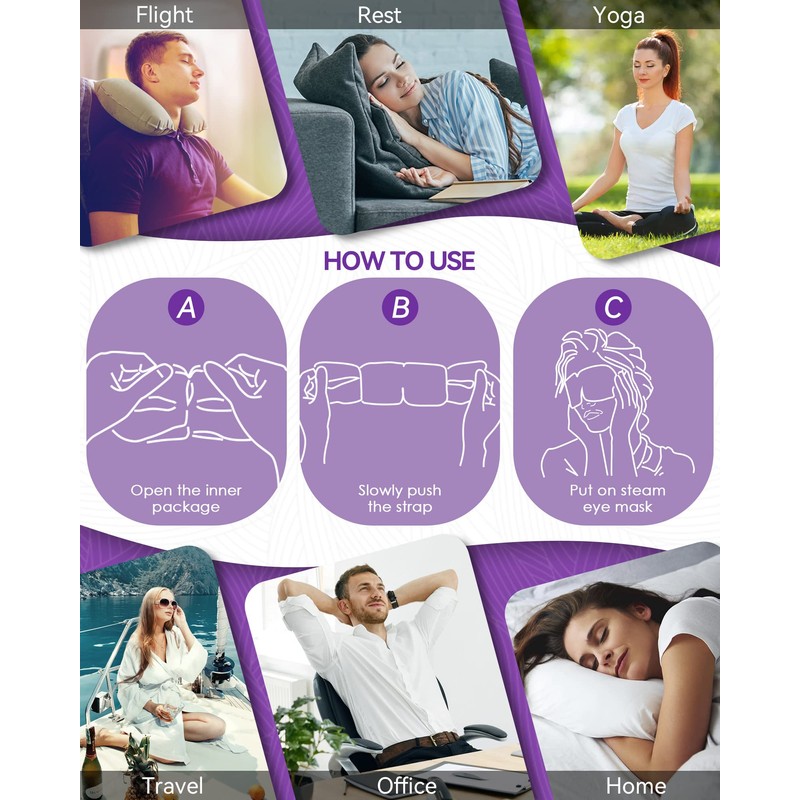 - 【Self-Heating Steam Eye Mask】ProCIV Steam Eye Mask is a simpler way to relieve eye fatigue, dry eyes, and red eyes. Just open and wear - no microwave or electric oven needed. The moist heated eye mask eliminates dark circles and puffy eye bands, stimulates blood circulation, reduces eye wrinkles, and relieves you of stress for a more comfortable night's sleep.