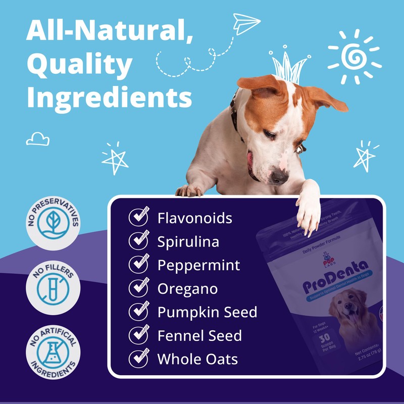 - Powerhouse Proprietary Blend: ProDenta is an expert-formulated dog dental powder for teeth and gum protection featuring a special blend of flavonoids and essential herbs. Like any Pup Labs dental supplement for dogs, ProDenta contains nature's finest spirulina, peppermint, and oregano working synergistically to support strong teeth, healthy gums, and keep tartar and plaque off for dogs' holistic dental health protection.