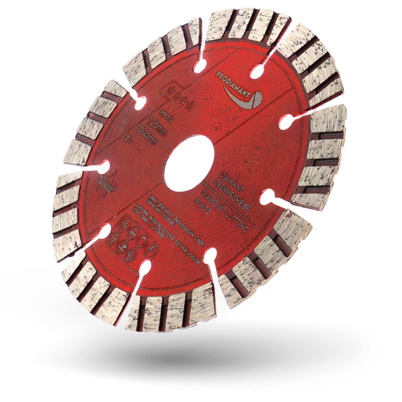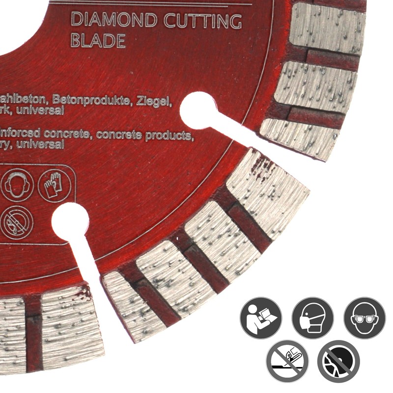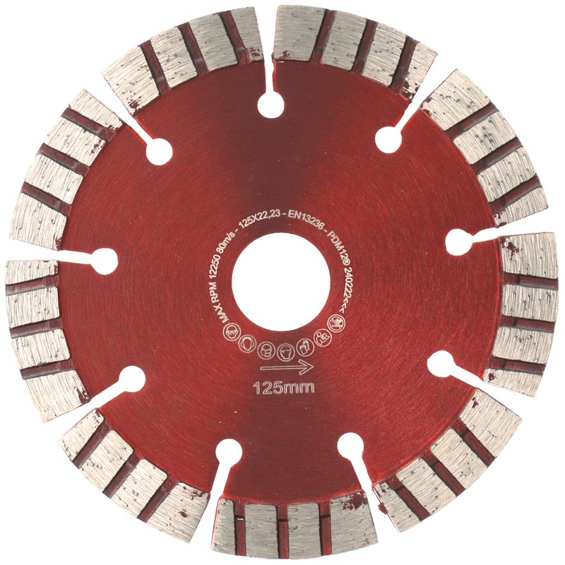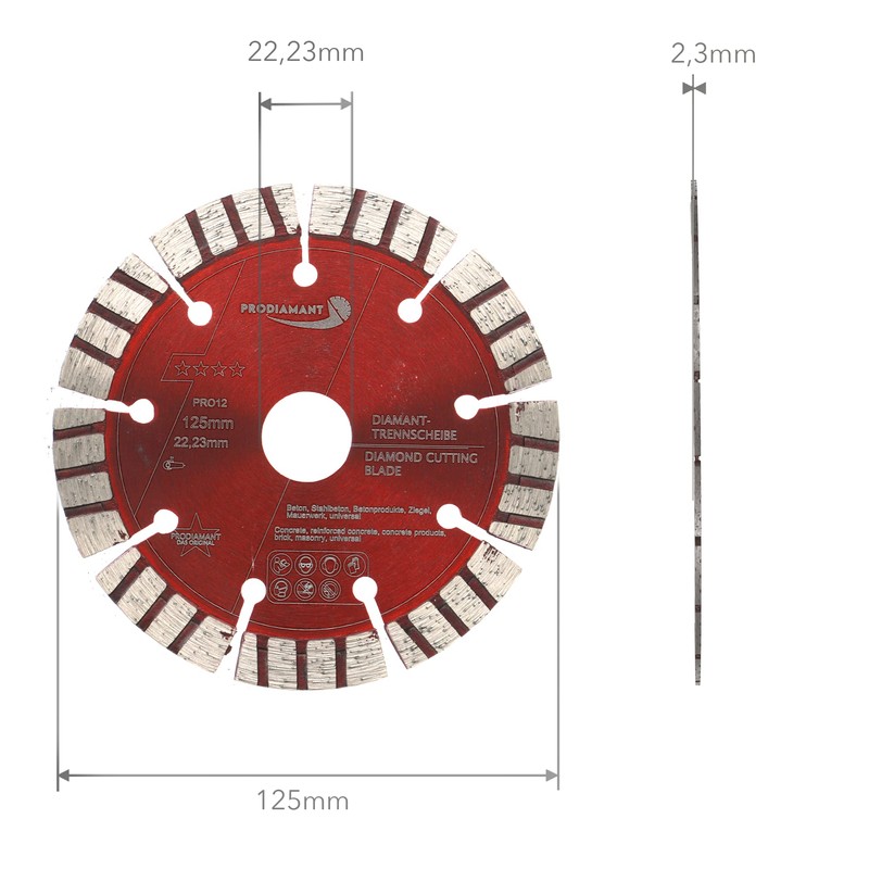 - Technical data: diamond disc diameter 125 mm with bore 22.23 mm, 12 mm turbo laser segment, 2.3 mm thick, fast cut and stable. Fits angle grinders and slotted milling machines