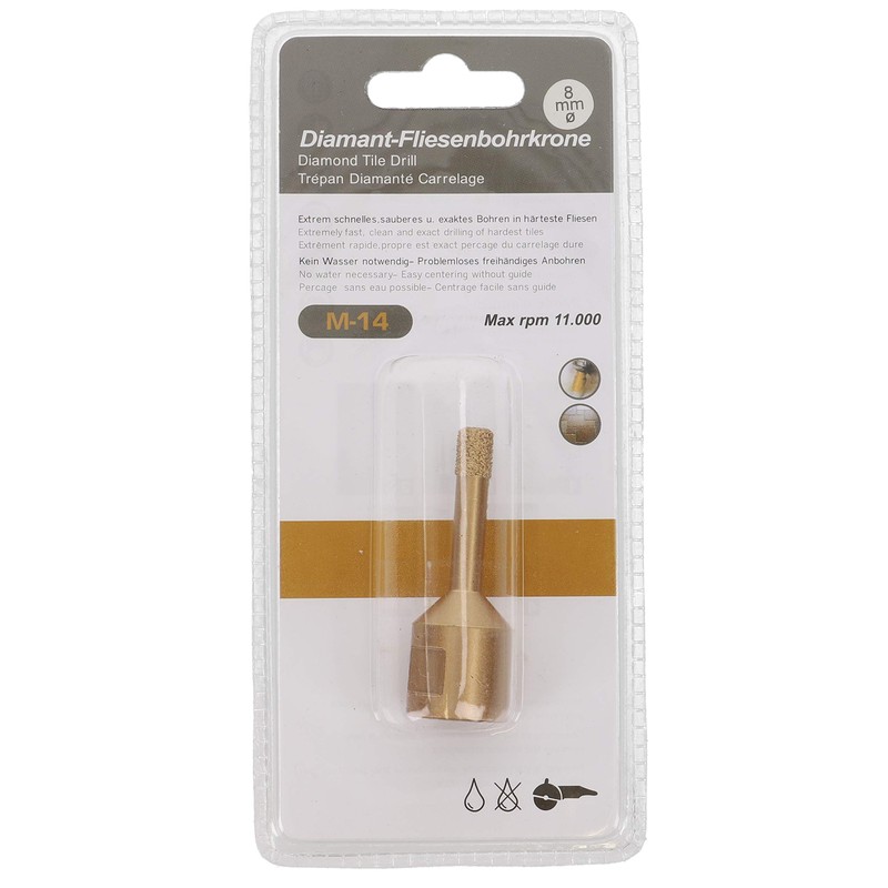 - Diamond tile drill from PRODIAMANT Hole diameter ø 8mm and M14 holder. Suitable for commercially available angle grinders with M14 mounting. Manufactured with high-quality industrial diamonds, for the highest demands in drilling speed and service life when drilling tiles.