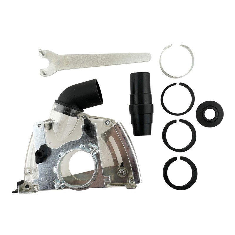- Box contents: extraction hood, 4 adapter rings for various angle grinders, rubber adapter for extraction, mounting tool