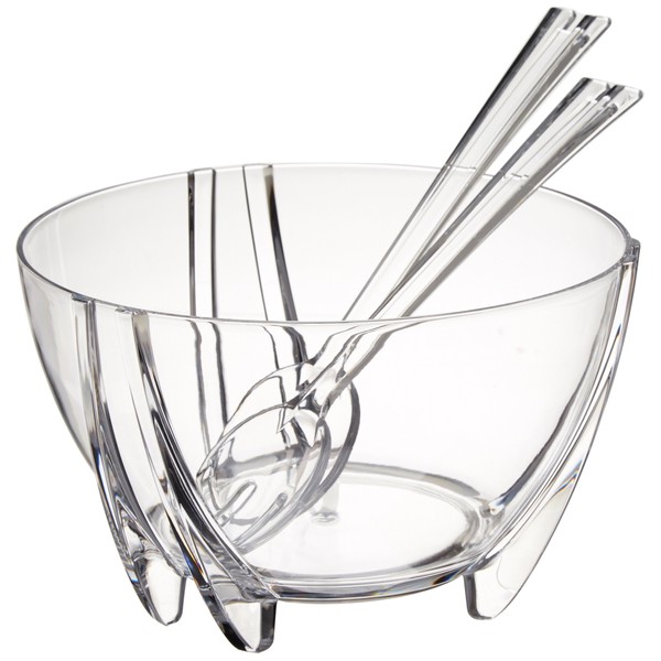 The acrylic bowl is as durable as it is beautiful. The thick bowl has artful designs and stable legs so it'll stay balanced through the entire buffet line, even when the salad is gone. The large salad bowl can accommodate 6 quarts of salad of any kind - green, pasta, potato - dressed and tossed however you like. The included salad servers make it easy to serve your masterpiece at the table or for guests to help themselves. BPA free.