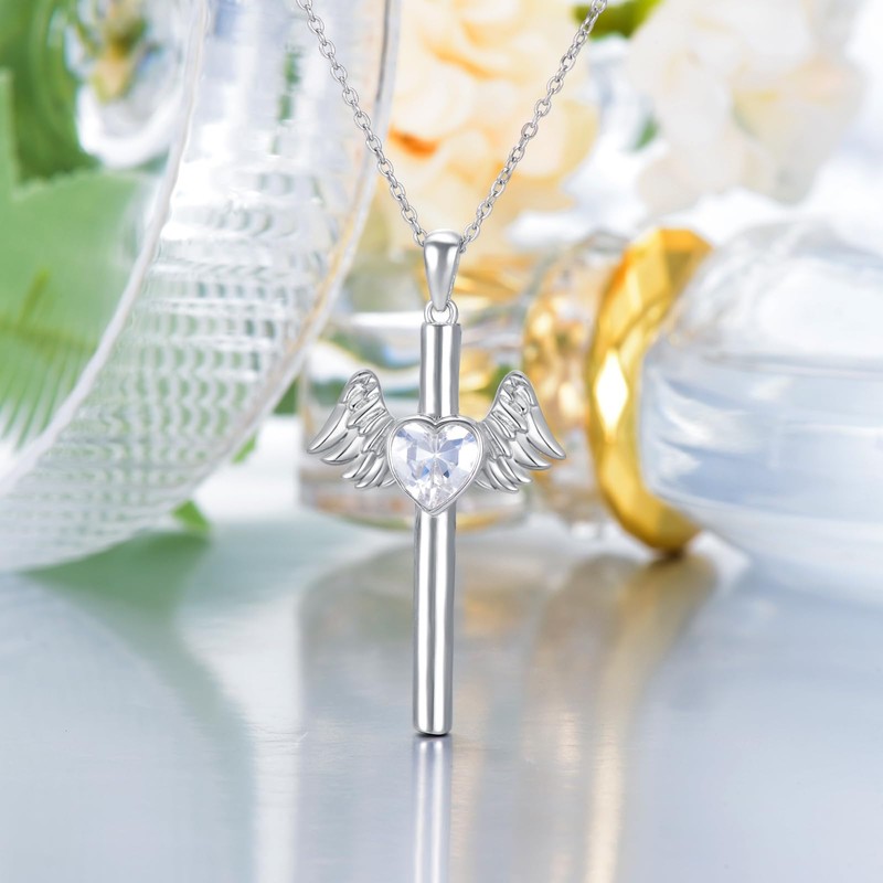 PROESS Cross Necklace Angel Wing Necklace for Women S925 Sterling Silver Angel Wing Pendant Birthstone Cross Jewelry Gift