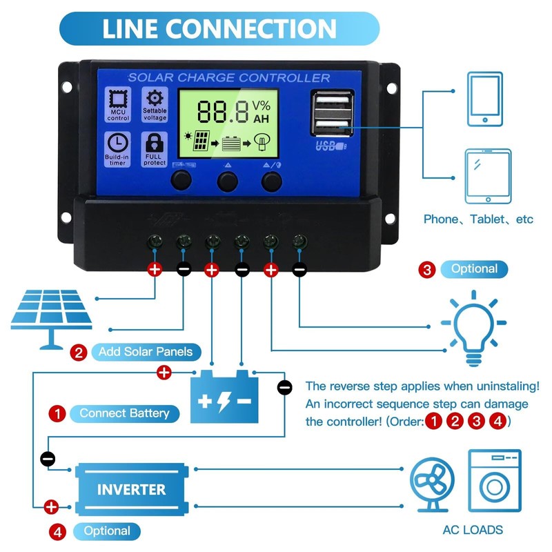 3. Connect to the consumer for the charge controller plus and minus.the reverse order applies when uninstalling!