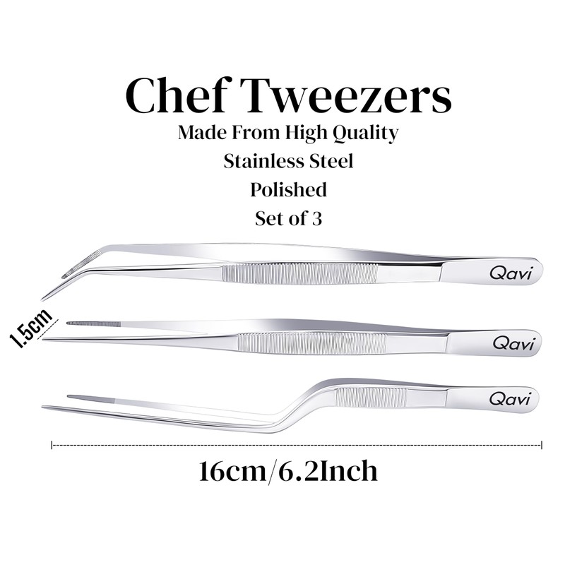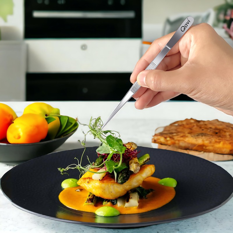 - PURPOSE - Chef tweezers also known as plating tweezers or culinary tweezers, are a specialised tool used by chefs to precisely place and arrange food on a plate. Designed with a long, thin pointed tip that allows chefs to delicately manoeuvre food items with precision. Chef tweezers are used to add the finishing touches to a dish, such as garnishes or delicate components, such as edible flowers or micro-greens.
