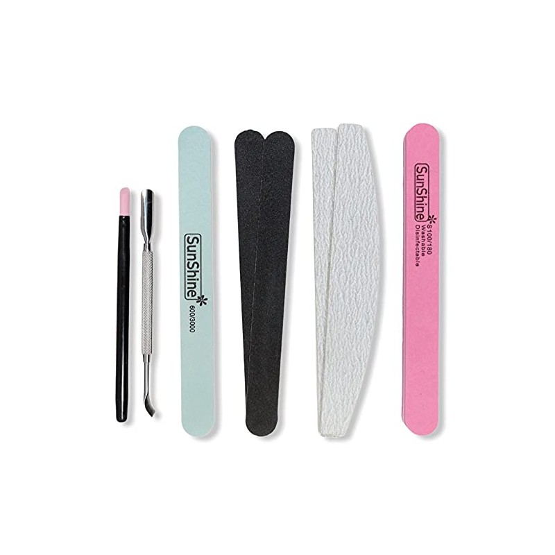 - 1 x 100/180 sponge file, 2 x 100/180 zebra files, 2 x 180G emery boards, 1 x 600/3000 shinner, metal pusher, stone pusher