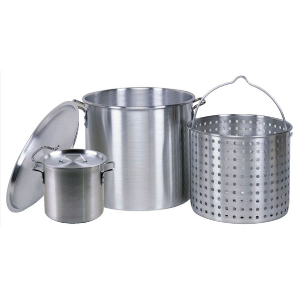 - PROFESSIONAL QUALITY Our heavy gauge aluminum boiling pot with strainer basket and lid have riveted handles for strength and durability.