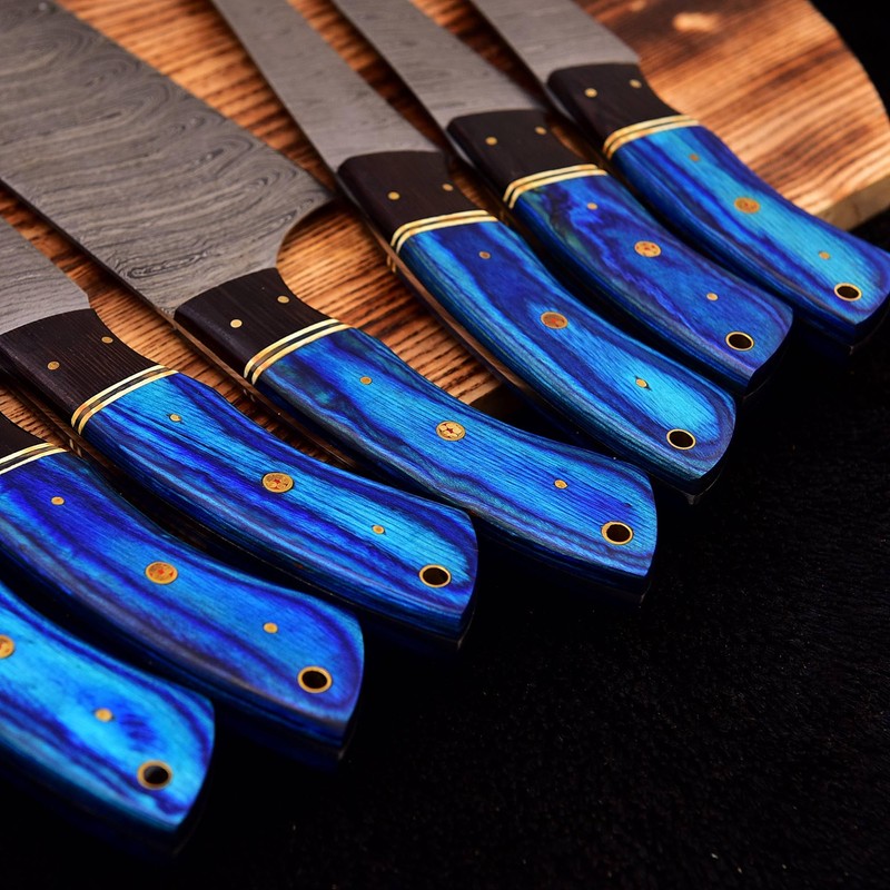 - Exceptional Craftsmanship: Showcasing the intricate Damascus patterns, this knife set features expertly forged blades with a striking blue and black wood handle design.