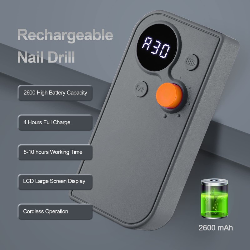 - 【Rechargeable nail drill】The nail drill machine has the characteristics of super battery life, which can be used for 8-10 hours after charging in 3.5 hours. The clear screen makes it so much easier to know that how much of a charge it has left. The cordless design of the nail drill means you don't have to do your nails near an outlet!