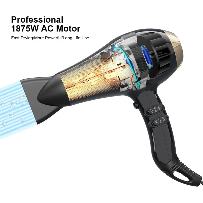 Professional Powerful Hair Dryer Negative Ionic 2 Speeds and 3 Temperature Settings and Cool Shot Button 1875w AC Motor Fast Drying Blow Dryer with Concentrator
