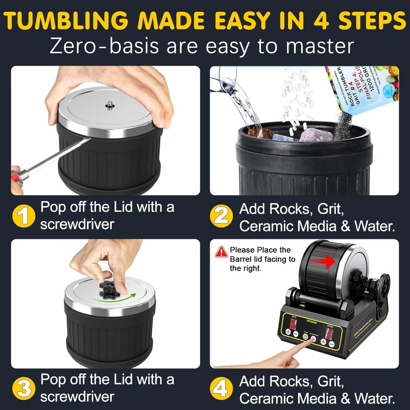 -2. Noise when tumbling, the whole tumbling process may take 1 week or a month, we recommend that you put it in the basement, garage or cover it with a box so that it will not disturb your family and your neighbors.