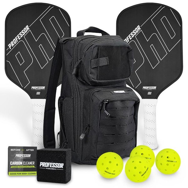 Professor PhD Raw Carbon Fiber Pickleball Paddle - 16MM - USA Pickleball Approved - Honeycomb Core - Power & Control:_PHD Black Edge Bundle