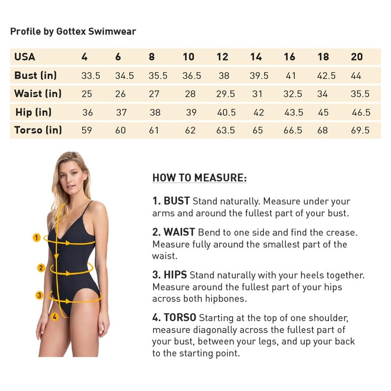 - Sizing: We recommend sizing up, as Profile by Gottex swimsuits tend to run small. This ensures a comfortable and flattering fit. Available sizes are US 6, EU 36; US 8, EU 38; US 10, EU 40; US 12, EU 42; US 14, EU 44; US 16, EU 46.