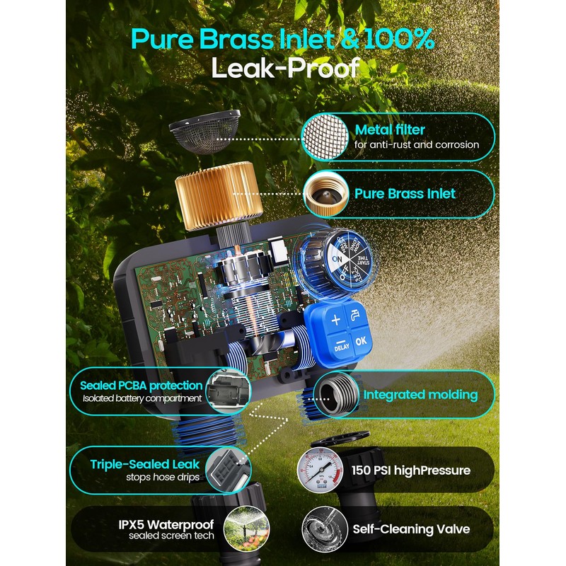 - Rugged Brass Inlets & Leak-Proof Performance: Designed with solid brass connectors, this water timer offers superior durability and a completely leak-proof seal. Its 360° secure connection prevents leaks at the faucet and hose, while the IPX5 waterproof and UV-resistant housing ensures long-lasting performance in all weather conditions. Built to handle water pressure up to 150 PSI and a 30L/min flow rate, it’s perfect for high-pressure irrigation systems and everyday garden watering.