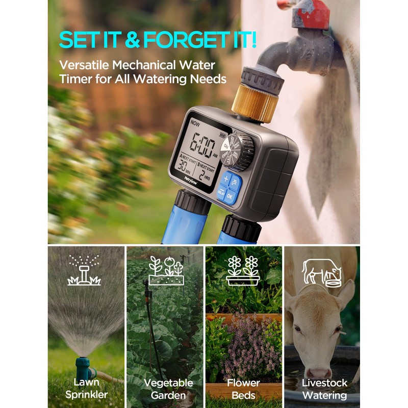 - Fast Setup & Easy Operation: Install this hose timer in minutes with its simple dial and button system—no tools required. The 360° rotating connector makes faucet attachment quick and hassle-free. The large LED display and user-friendly controls make scheduling easy, providing a seamless experience for all users. Includes a quick-connect adapter for effortless hose installation.