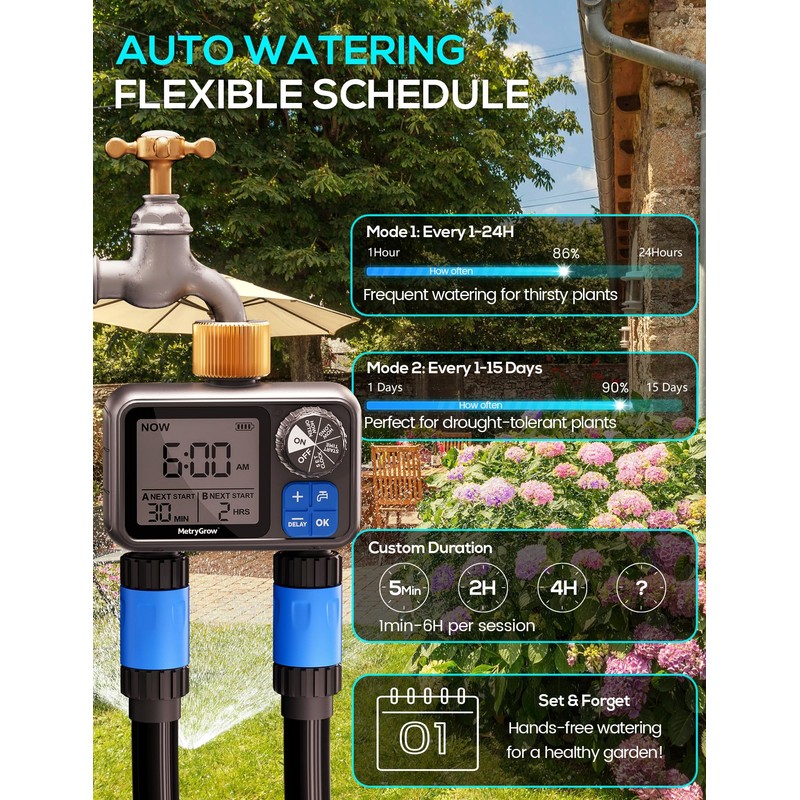 - Dual-Zone Customizable Watering: Effortlessly manage two independent watering zones to meet different plant needs. Adjust watering frequency from every 1 to 24 hours for water-loving plants or every 1 to 15 days for drought-resistant ones. With flexible watering durations from 1 to 360 minutes, this programmable timer is ideal for gardens, lawns, and greenhouses. Enjoy automated, worry-free irrigation that keeps your outdoor space perfectly watered without constant monitoring.