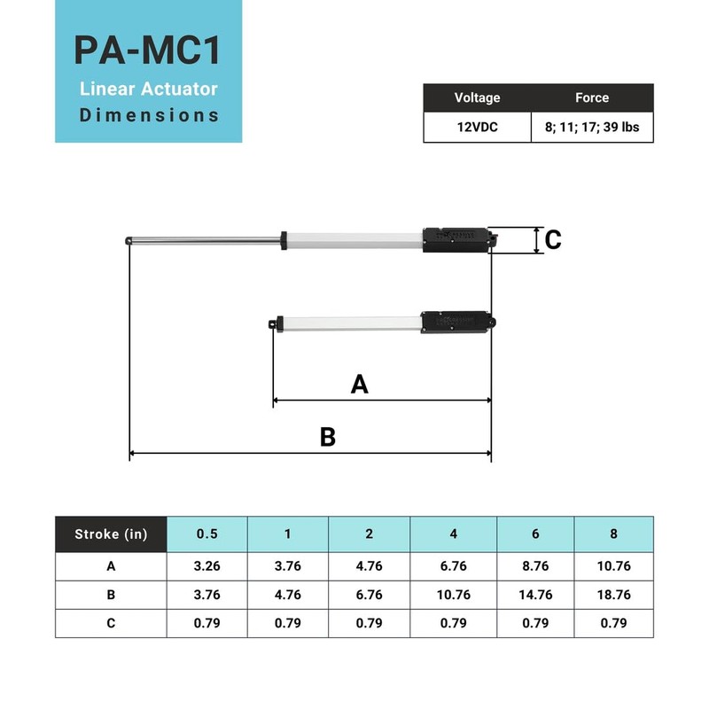 - Compact Versatility - The PA-MC1 is our smallest linear actuator offering a compact design with 11 lbs force, a stroke length 8", and a fast speed of 1.18"/sec unloaded