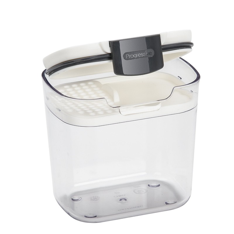 The Prepworks by Progressive Mini ProKeeper storage container combines high quality construction with a silicone seal for air-tight storage. It is a perfect kitchen organizer for spices, herbs, candy and snacks. The included leveler and sliding dusting screen are removable and sit under the lid for easy storage. The 1.5 cup storage container holds up to a standard box of baking soda and also includes an easy-catch latch that holds the lid tightly closed. The hinged lid flips to fit in the dishwasher for easy care. The Prepworks by Progressive Mini ProKeeper measures 4"" L x 3.5"" W x 3.5""H.