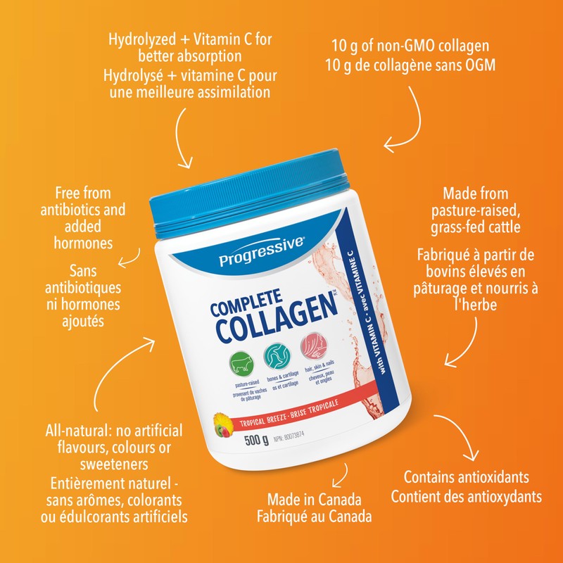 Progressive Progressive Complete Collagen Tropical Breeze, Canadian-Made, for Healthier Hair, Skin, Nails and Joints. Grass-Fed Non-GMO with Antioxidants, Hydrolyzed with Vitamin C for Best Absorption, 500 g