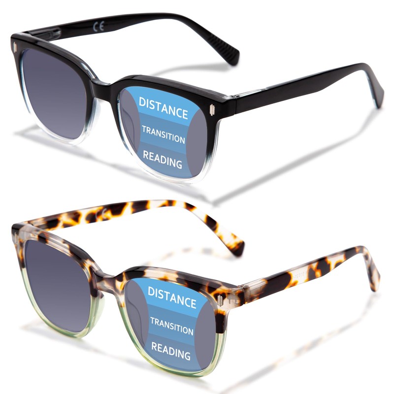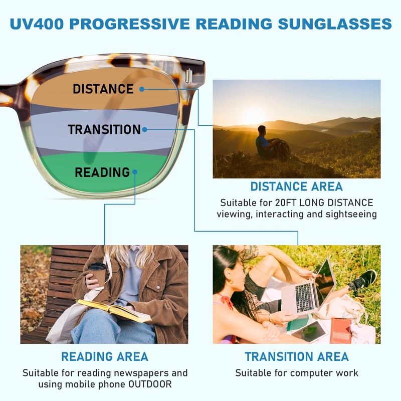 - 【Reading Sunglasses】The 2 in 1 eyeglasses are not noly reading glasses but also sunglasses. Progressive multifocus reading sunglasses with UV protection lenses can filter harmful ultraviolet light(UVA/UVB) so that you can read books or using mobile phone outside.