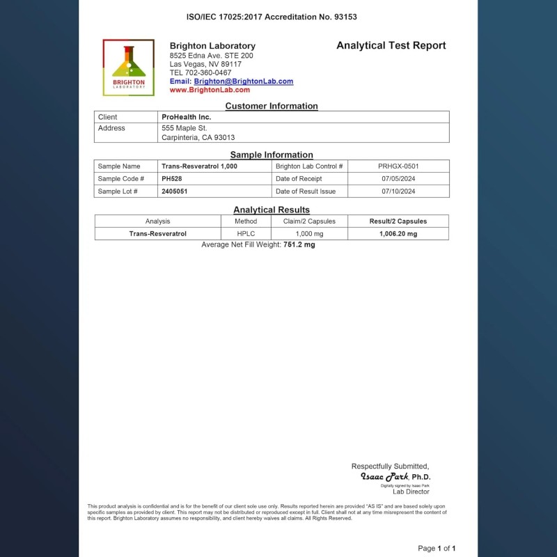 - BIOLOGICALLY ACTIVE FORM OF RESVERATROL - Regular resveratrol is composed of 50% trans-resveratrol and 50% cis-resveratrol but only trans-resveratrol is active. ProHealth's Trans-Resveratrol delivers 1000 mg of pure, natural trans-resveratrol per serving and no cis-resveratrol.