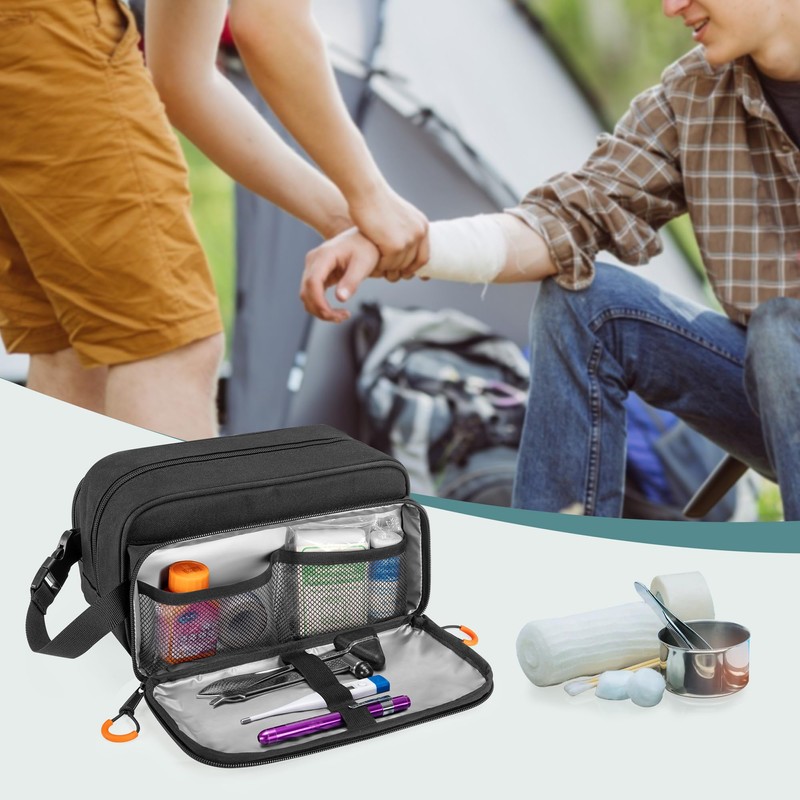 - YOUR MOBILE AID STATION: 3 elastic loops and 3 pouches in main compartment help organize small-sized first aid essentials like iodine wipes, bandages, and medical tape. Remaining large capacity is plenty for other bulky supplies like pill bottles, gauze rolls, and 75% alcohol. The well-organized system ensures the safety of first aid supplies while on the go.