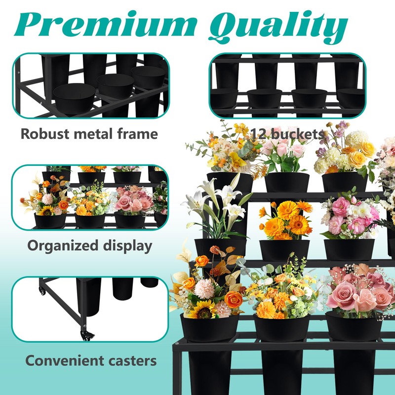 - 【Built to Last】Made from a durable metal frame, our display stand offers superior sturdiness and a high load-bearing capacity. It comes with 12 spacious flower buckets to hold water or soil, ensuring your blooms remain fresh and vibrant. The stand is also equipped with four 360-degree swivel casters, enabling you to move your flower display easily to any desired location.