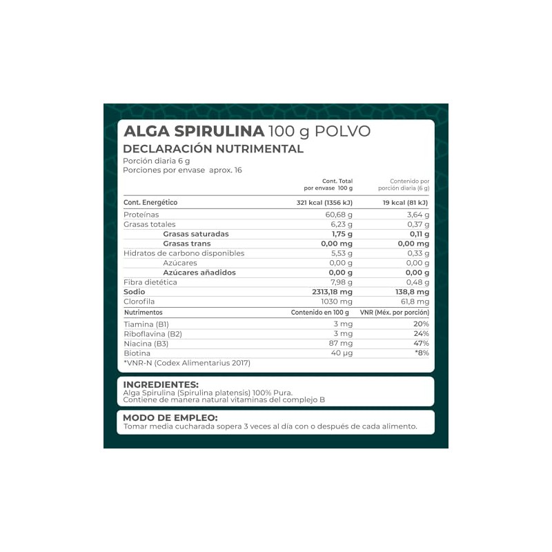 Acerca de este artículo LO QUE NECESITAS SABER. Bote con 100 g de Alga Spirulina 100% pura en polvo, ideal para licuados y smoothies, con nutrientes para una correcta alimentación en cualquier etapa de la vida. Es un producto no alérgeno y libre de gluten INGREDIENTES DESTACADOS. Aporta proteínas, clorofila, vitaminas B1, B2, B3 y biotina BIENESTAR SIMPLE. Entendemos que llevar una vida sana puede ser complicado, por eso tenemos un portafolio enfocado en cada una de tus necesidades, simplificando tus elecciones. Te invitamos a averiguar sobre los beneficios del alga spirulina SIEMPRE TE RECORDAMOS. Manténgase en un lugar fresco y fuera del alcance de los niños SOBRE PRONAT. Pronat es una marca con más de 45 años de experiencia en el mercado. Somos líderes en el segmento y ofrecemos productos de la más alta calidad, desarrollados en conjunto con nutriólogos y profesionales de la salud