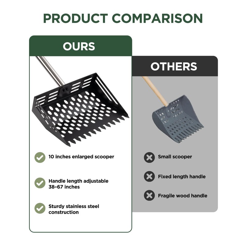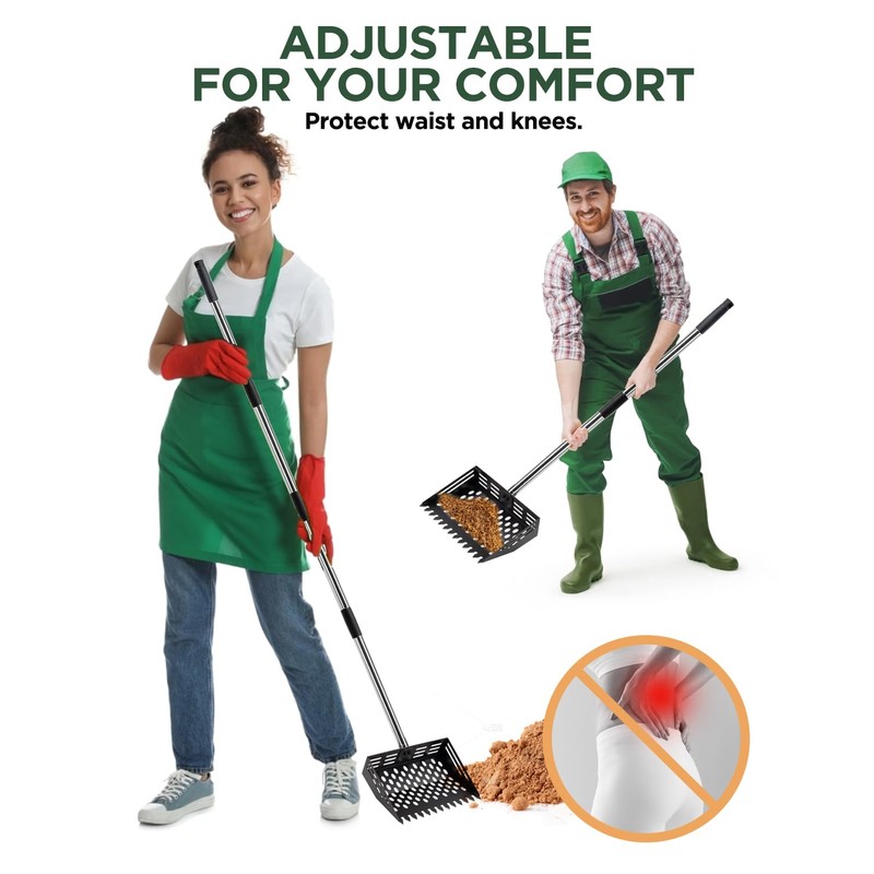 - Multi-PurposeOne tool for three tasks: poop scoop, litter sifter, and garden rake. Features a rust-proof surface that cleans easily with water. Perfect for chicken coops, composting, and pet care.