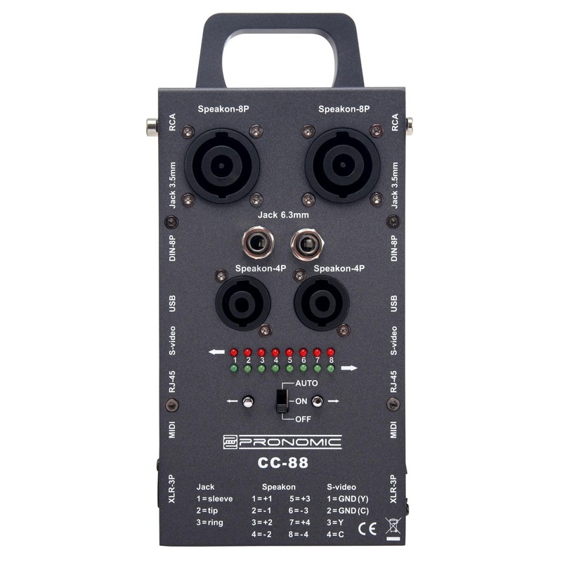 With the Pronomic CC-88 multi-cable tester,  you can check the most common cable connectors for audio electronics devices, such as XLR (3-pin), SPK (Speakon 4- and 8-pin), MIDI, jack (6.35mm / 3.5mm and stereo / mono), digital RJ45, S-Video, RCA (RCA) and more. It provides an LED display that visually represents whether there is a correct flow or faulty connection.