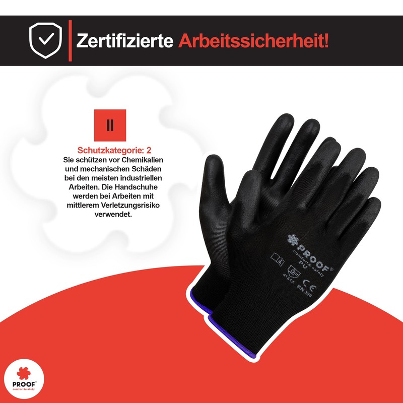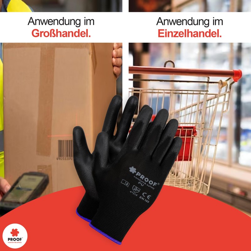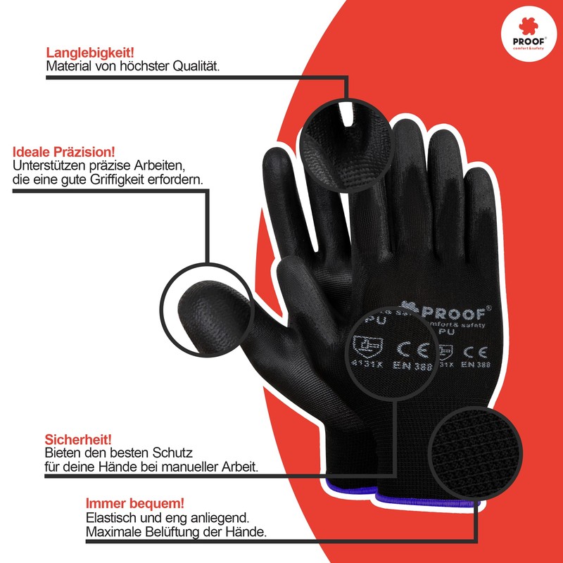 PROOF COMFORT & SAFETY Polyester Gloves with Rough Latex Coating Protective Gloves, Work Gloves for Mechanics, Construction Workers (Black Polyurethane Coated, 7)