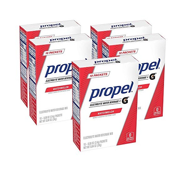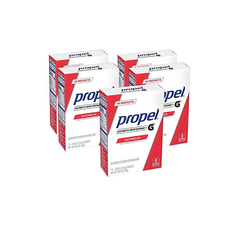 - Contains five (5) 10-count boxes of Propel Powder Packets Watermelon flavor, with Electrolytes, Vitamins and No Sugar