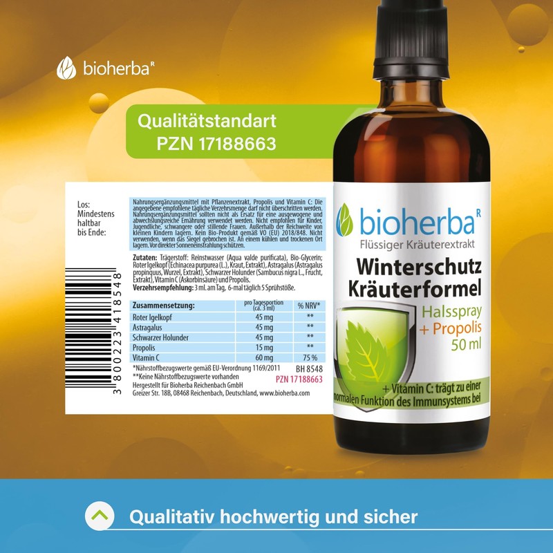 Hinweise: Nahrungsergänzungsmittel mit Pflanzenextrakt, Propolis und Vitamin C. Die angegebene empfohlene tägliche Verzehrsmenge darf nicht überschritten werden. Nahrungsergänzungsmittel sind kein Ersatz für eine ausgewogene und abwechslungsreiche Ernährung sowie eine gesunde Lebensweise. Nicht empfohlen für Kinder, Jugendliche, schwangere oder stillende Frauen. Außerhalb der Reichweite von kleinen Kindern lagern. Kein Bio-Produkt gemäß VO (EU) 2018/848. Nicht verwenden, wenn das Siegel gebrochen ist. An einem kühlen und trockenen Ort lagern. Vor direkter Sonneneinstrahlung schützen.