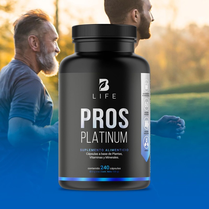- Pros Platinum es un suplemento alimenticio con 240 cápsulas a base de Ciruelo Afircano, Cúrcuma, Semillas de Calabaza, Ácido Glutámico, Glicina adicionado con Vitaminas.