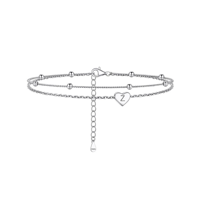 PROSILVER 925 Sterling Silver Heart Initial Anklet for Women Double Layer Adjustable 22+5cm, Sterling Silver, No gemstones