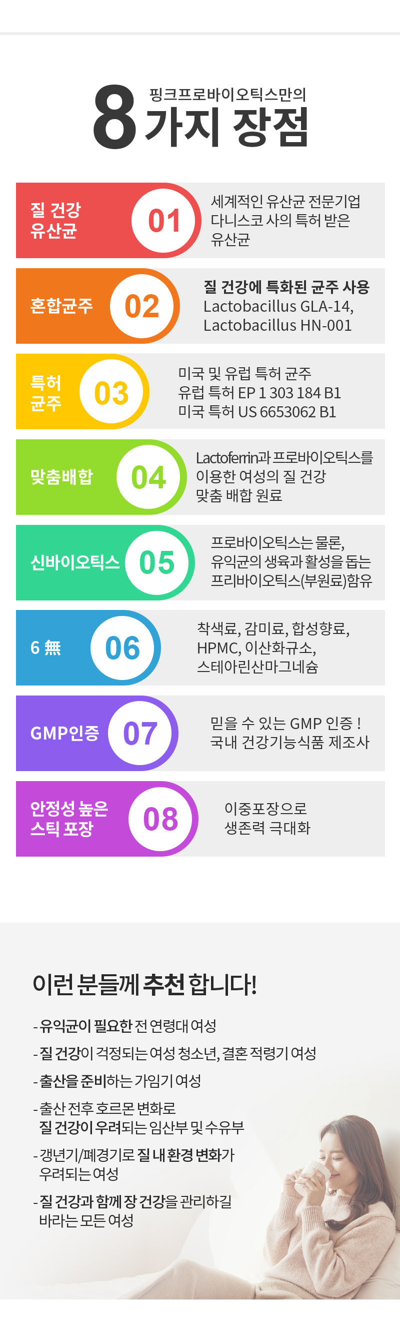 | 기능정보 | 리스펙타(Respeta®)[프로바이오틱스] 질내 유익균 증식 및 유해균 억제에 도움을 줄 수 있음, 유산균 증식 및 유해균 억제, 배변활동 원활, 장건강에 도움을 줄 수 있음 |