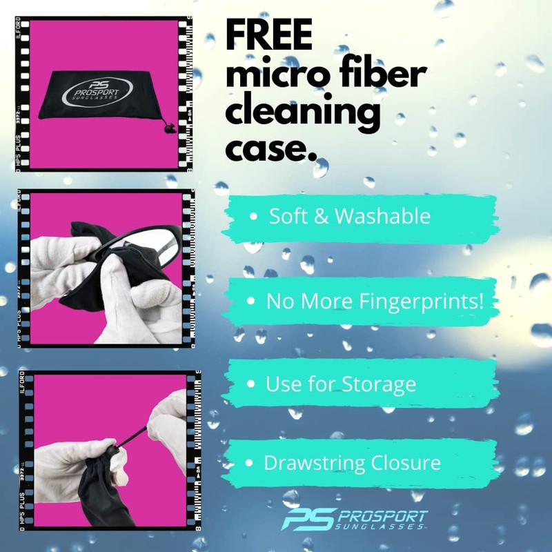 - FREE LOGO MICROFIBER CLEANING POUCH: While the sunglasses are in the pouch, simply rub the lenses with the soft microfiber to wipe off fingerprints, smudges and water marks. Take the sunglasses out and they are nice & shiny. Drawstring with tightening closures keeps the glasses secure inside.