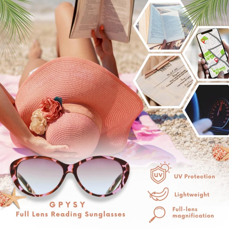 - WHY TINTED SUNREADERS?? Now you can read your favorite book outside by the pool or on the beach without squinting. Sun readers don’t have a bifocal line – the ENTIRE lens is magnified. That’s why they are also called ‘no line bifocals.’ Sun readers can also be used to correct far sightedness (can’t see objects close up.) Simply match the “+” power with your Sphere power on your prescription. Sun readers have 100% UV protection.