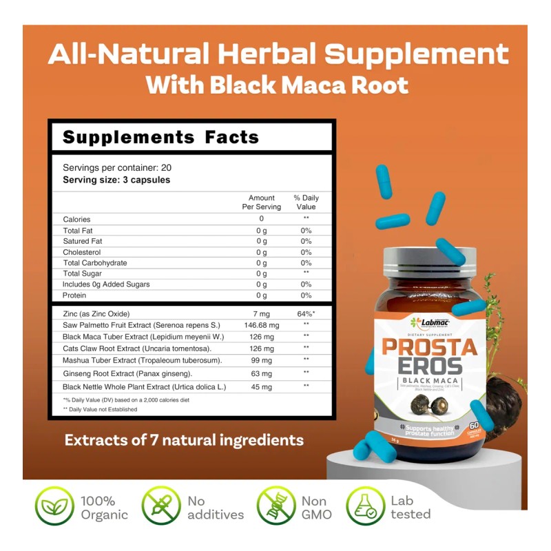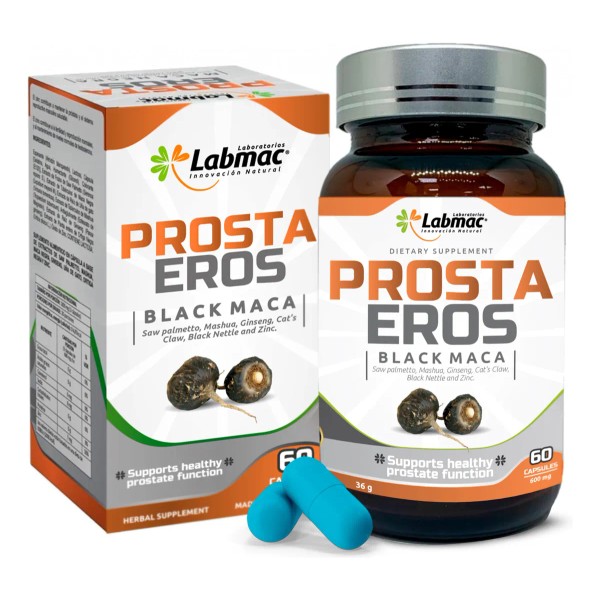 Prosta Eros es un suplemento natural diseñado para apoyar la salud de la próstata y mejorar la energía. Con 7 ingredientes activos como Maca Negra y Saw Palmetto, ayuda a mantener el rendimiento físico y mental. Presentación: 60 cápsulas en un paquete para tomar diariamente.