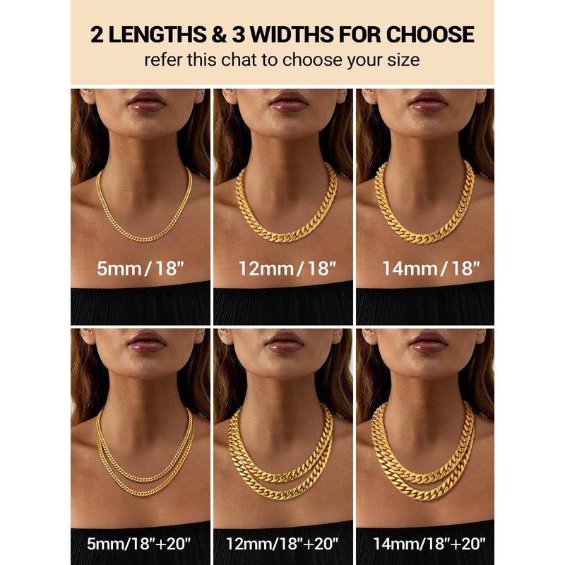 - Stylish Miami Cuban Chain: Cuban link chain 3 widths 5mm/12mm/14mm & 2 lengths 18" and 20" available, featuring a distinctive and eye-catching design infused with vibrant hip-hop cultural elements.it rests elegantly at the collarbone, making it versatile enough to pair with both casual and formal outfits. For a trendy urban streetwear look, layer it with longer chains to create a comfortable yet fashion-forward layered style.