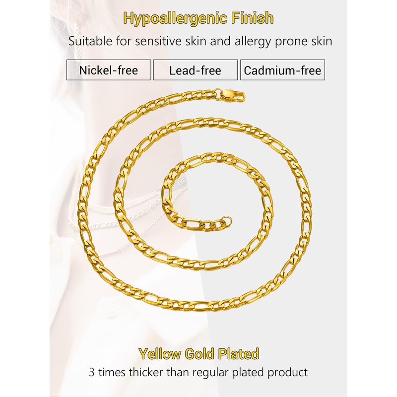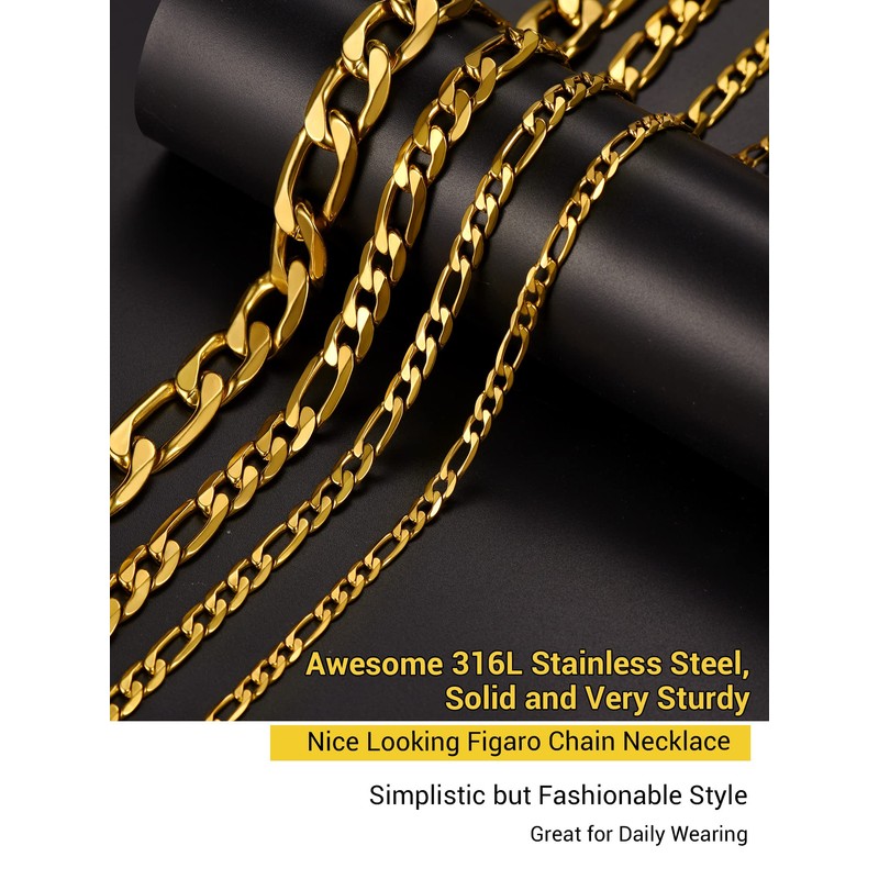 Prosteel Men's Stainless Steel 18K Gold-Plated Classic Figaro Chain / Necklace, 5 / 6 / 7 / 10 mm Wide, 3+1 Link Chain / Hip Hop Chain 36 + 5 / 46 / 51 / 55 / 61 / 66 / 71 / 76 cm, Gold Plated