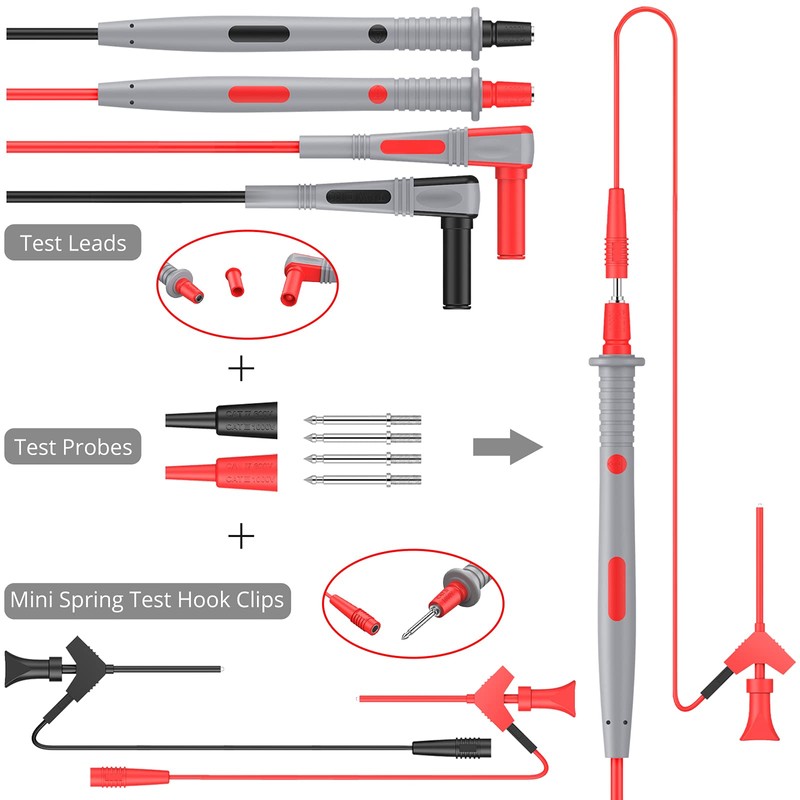 • 23 in 1 Multi Test Leads Kit--- This Multimeter Test Leads Kit Come with Test Leads, Test Probes Tips, Probes Tips Caps, Mini Spring Test Hook Clips, Crocodile Clips, Banana Plug, Spade Plug, SMD Patch Test Clip, Back Probe Pins