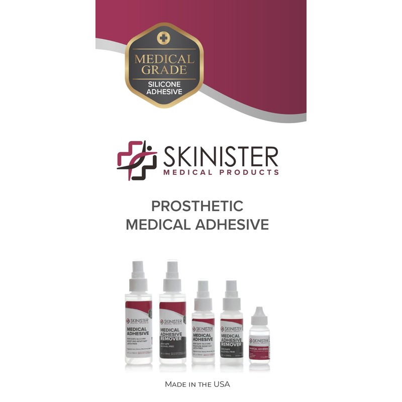 Skinister Medical Adhesive Spray is skin safe glue designed to adhere silicone prosthetics. Designed for medical uses, visual effects, and cosplay costumes. Attach silicone hip pads, mastectomy’s breast forms, and ostomy appliances safely to your skin. Safely attach eyebrows, body jewelry, and other costume prosthetics. Use Skinister Medical Adhesive Remover to safely clean prosthetics and remove adhesive in-between applications.